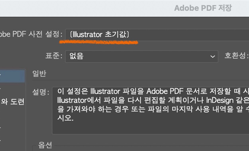 제일 위쪽 '사전 설정' 부분을 보면 [Illustrator 초기값]이라고 돼있으실 거에요.