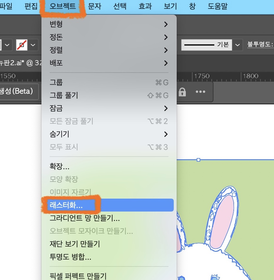 일러스트 선택 > 오브젝트 > 래스터화
