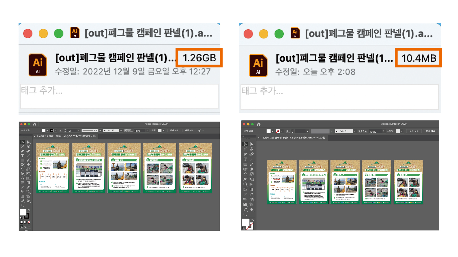 사진이 많이 들어간 일러스트 파일 1.26gb -> 래스터화 후에 10.4mb로