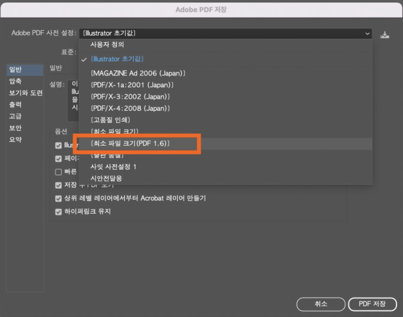 옵션을 저장해놓고 인쇄용 PDF, 웹용 PDF 등 이름을 붙여놓으면